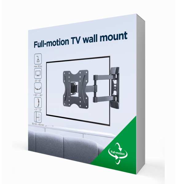 Gembird WM-42ST-02. Maximum weight capacity 30 kg, Minimum screen size 58.4 cm (23), Maximum screen size 106.7 cm (42), Minimum VESA mount 100 x 100 mm, Maximum VESA mount 200 x 200 mm. Tilt angle range -10 - 3°, Swivel angle range 90 - 90°, Distance to the wall (min) 5.6 cm, Distance to the wall (max) 41.5 cm. Product colour Black