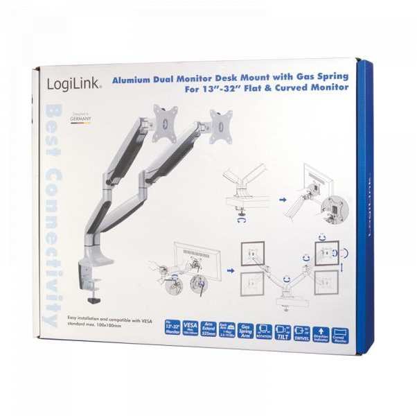 Suitable for 1332 LCD, LED, PC and TV monitors Carrying capacity of each arm Max. 9 kg / 19.8 lbs Mounting type Tilt -90°/+90°, swivel -90°/+90°, level adjustment -90°/+90° VESA compatibility 75x75, 100x100 With gas spring Elegant aluminum design For 2 monitors Arm length Each 525 mm