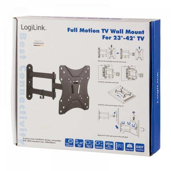 LogiLink BP0008. Suitable for TV, Maximum weight capacity 25 kg, Minimum screen size compatibility 58.4 cm (23), Maximum screen size compatibility 106.7 cm (42), Minimum VESA mount 75 x 75 mm, Maximum VESA mount 200 x 200 mm. Tilt angle range 7.5 - 7.5°, Distance to the wall (min) 7.2 cm, Distance to the wall (max) 40.3 cm. Product colour Black