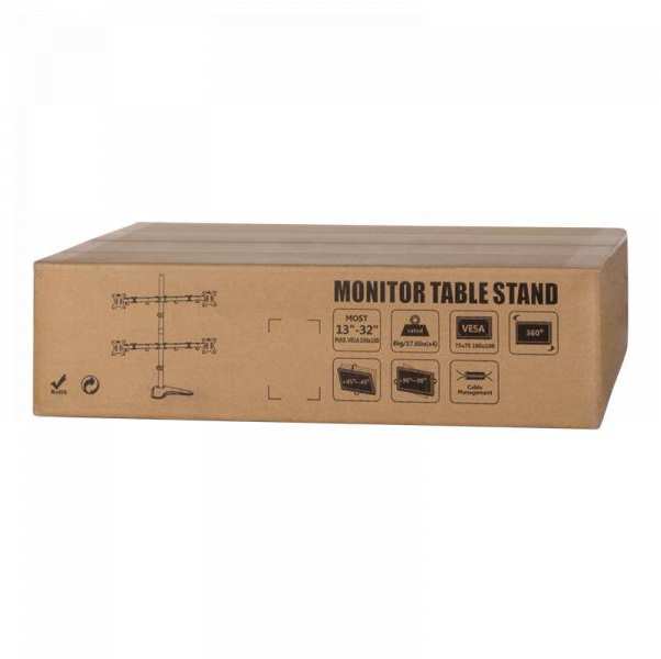 Suitable for 1332 LCD, LED, PC and TV monitors Carrying capacity of each arm Max. 8 kg / 17.6 lbs Mounting type Tilt -45°/+45°, swivel -90°/+90°, rotation -180°/+180° VESA compatibility 75x75, 100x100 Maximum arm length Each 460 mm For 4 monitors