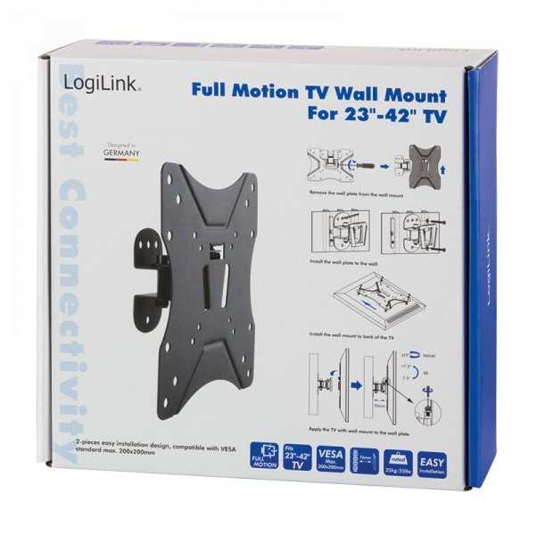 Flat construction, extreme solid and secure Suitable for 2342 LCD, LED, PC and TV monitors Carrying capacity Max. 25 kg / 55 lbs Mounting type Tilt -7.5°/+7.5°, swivel -25°/+25° VESA compatibility 75x75, 100x100, 200x100, 200x200 Wall clearance 76 mm