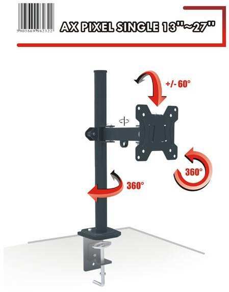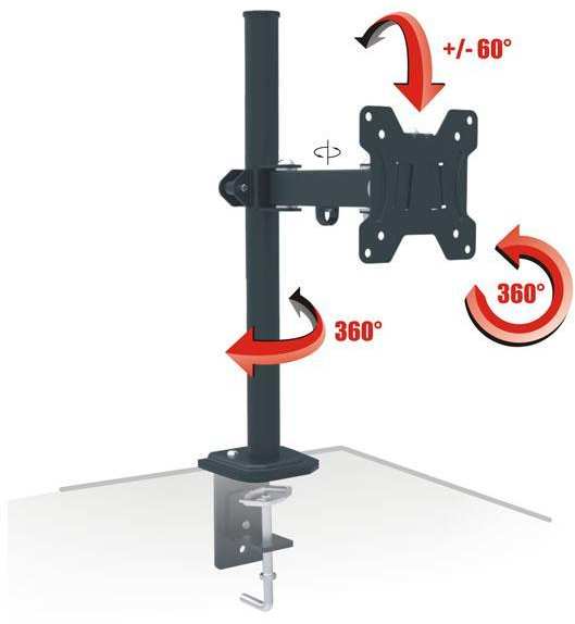 - TV Format 13 -27 - Max. Load 8 kg (17 lbs) - VESA 100x100 mm - Tilt +/- 60 ° - Swivel 360 ° - Rotation 360 ° - Cable management - Color black