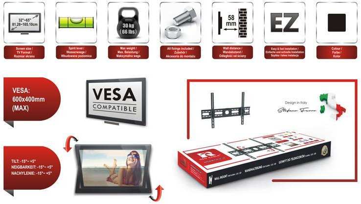 - Screensize 32-65 / 81.28-165.10 cm - Spirit level - Max. weight 30 kg (66 lbs) - Wall distance 58 mm - VESA 600x400 mm - Tilt -15° - +5° - Color black - Product weight 1,80 kg