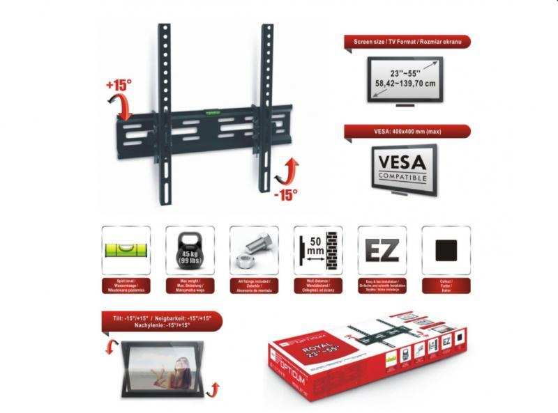 Screensize 23-55 / 58.42-139.70 cm Spirit level Max. weight 30 kg (66 lbs) Wall distance 58 mm VESA 400x400 mm Tilt -15°-+5° Color black Product weight 1,65 kg