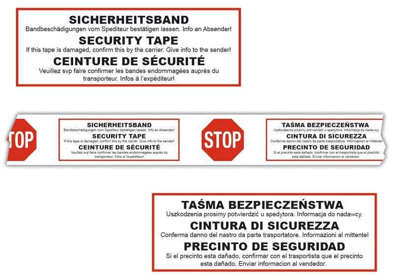 Warntext 6-sprachig Sicherheitsband + Security Tape + Ceinture de Sécurité + Tasma Bezpieczenstwa + Cintura di Sicurezza + Precinto De Deguridad und das STOP-Symbol.