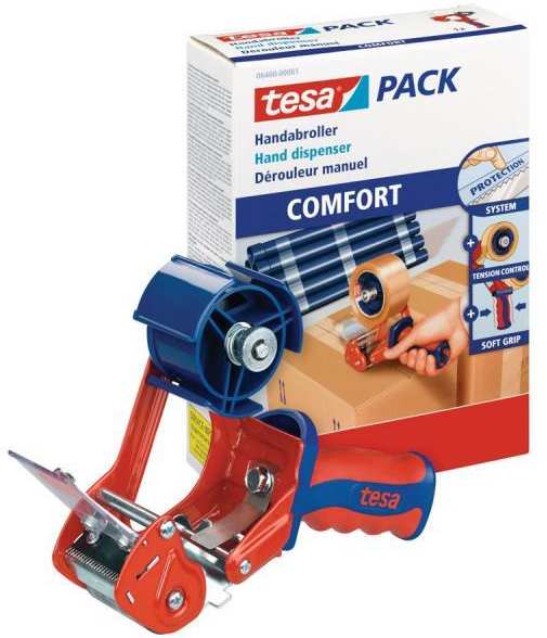 Handabroller Tesa Comfort. Für Klebe- und Paketband Rollen (50 mm x 66 m) mit einem Kerndurchmesser von 76 mm. Ideal zum Verkleben und Verschliessen von Kartons oder Folien mit Paketband - leichte Handhabung.