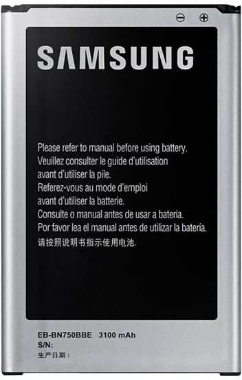 Samsung EB-BN750BBECWW. Product type Battery, Product colour Black,Silver, Battery capacity 3100 mAh. Width 51.4 mm, Height 78.2 mm, Depth 5.7 mm. Compatible products GALAXY Note 3 Neo