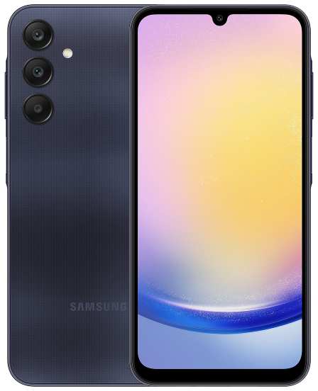 Samsung Galaxy A25 5G . Display diagonal 16.5 cm (6.5), Display type AMOLED. RAM capacity 6 GB, Internal storage capacity 128 GB. Rear camera resolution (numeric) 50 MP, Rear camera type Triple camera. Battery capacity 5000 mAh. Product colour Aura Blue