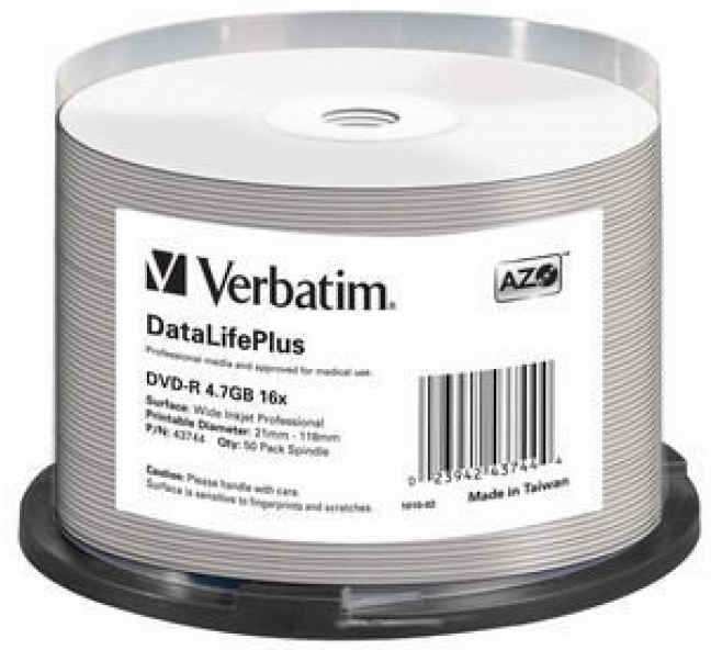 Verbatim DataLifePlus. Native capacity 4.7 GB, Type DVD-R, Optical disc diameter 120 mm. DVD-R write speed 16x. Package type spindle