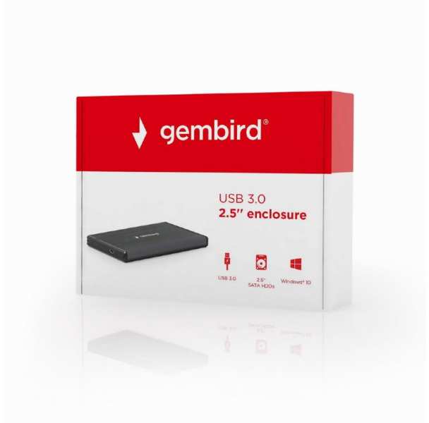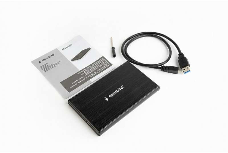 Gembird EE2-U3S-3. Storage drive size 2.5, Supported storage drive interfaces Serial ATA, Supported storage drive heights 7,9.5 mm. USB version 3.2 Gen 1 (3.1 Gen 1), USB connector type Micro-USB B, USB connector gender Female. Product type HDD enclosure, Product colour Black, Material Aluminium,Plastic. Data transfer rate 5 Gbit/s, Chipset JMS578. Power source type USB