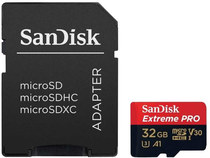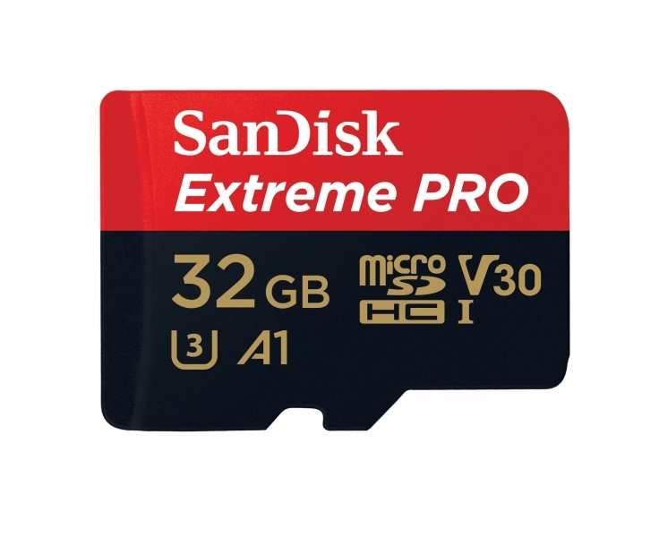 Sandisk Extreme Pro. Capacity 32 GB, Flash card type MicroSDHC, Flash memory class Class 10, Internal memory type UHS-I, Read speed 100 MB/s, Write speed 90 MB/s, UHS Speed Class Class 3 (U3), Video Speed Class V30. Protection features Shock resistant,Splash proof,Temperature proof,Waterproof, Product colour Black,Red