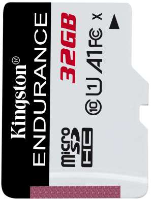 Kingston Technology High Endurance. Capacity 32 GB, Flash card type MicroSD, Flash memory class Class 10, Internal memory type UHS-I, Read speed 95 MB/s, Write speed 30 MB/s, UHS Speed Class Class 1 (U1). Protection features Shock resistant,Temperature proof,Waterproof,X-ray proof, Product colour Black,White
