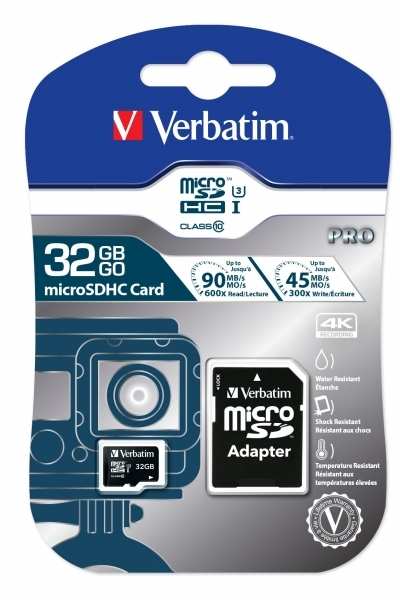 Verbatim Pro. Capacity 32 GB, Flash card type MicroSDHC, Flash memory class Class 10, Internal memory type UHS, Read speed 90 MB/s, Write speed 45 MB/s. Protection features Shock resistant,Water resistant, Product colour Black