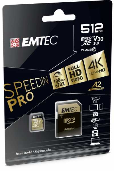 Emtec ECMSDM512GXC10SP. Capacity 512 GB, Flash card type MicroSDXC, Flash memory class Class 10, Internal memory type UHS-I, Read speed 100 MB/s, Write speed 95 MB/s, UHS Speed Class Class 3 (U3), Video Speed Class V30. Product colour Black, Gold