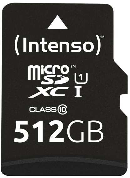 Intenso microSD Karte UHS-I Premium. Capacity 512 GB, Flash card type MicroSD, Flash memory class Class 10, Internal memory type UHS-I, Read speed 45 MB/s, UHS Speed Class Class 1 (U1). Product colour Black