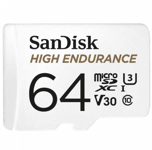 Sandisk High Endurance. Capacity 64 GB, Flash card type MicroSDXC, Flash memory class Class 10, Internal memory type UHS-I, Read speed 100 MB/s, Write speed 40 MB/s, UHS Speed Class Class 3 (U3), Video Speed Class V30. Protection features Shock resistant,Temperature proof,Waterproof, Product colour White