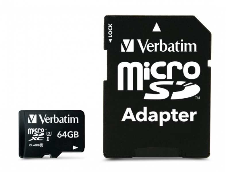 Verbatim Pro. Capacity 64 GB, Flash card type MicroSDXC, Flash memory class Class 10, Internal memory type UHS, Read speed 90 MB/s, Write speed 45 MB/s. Protection features Shock resistant,Water resistant, Product colour Black