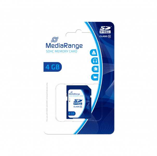 MediaRange 4GB SDHC. Capacity 4 GB, Flash card type SDHC, Flash memory class Class 10, Read speed 15 MB/s, Write speed 10 MB/s. Product colour Blue