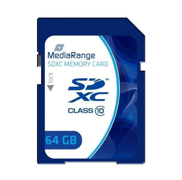 MediaRange MR965. Capacity 64 GB, Flash card type SDXC, Flash memory class Class 10, Read speed 60 MB/s, Write speed 15 MB/s. Product colour Blue