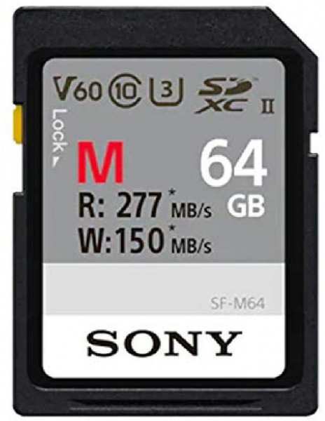 Sony SF64M. Capacity 64 GB, Flash card type SDHC, Flash memory class Class 10, Internal memory type UHS-II, Read speed 260 MB/s, Write speed 100 MB/s. Product colour Black