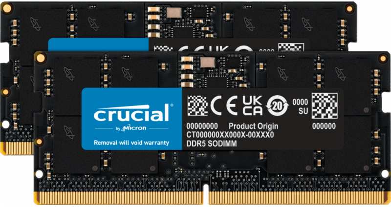 Crucial CT2K16G48C40S5. Component for Notebook, Internal memory 32 GB, Memory layout (modules x size) 2 x 16 GB, Internal memory type DDR5, Memory clock speed 4800 MHz, Memory form factor 262-pin SO-DIMM, CAS latency 40