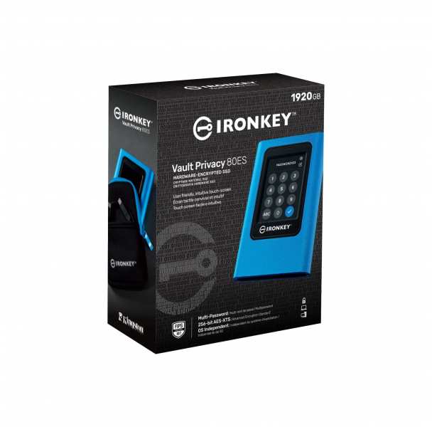 Kingston Technology IronKey Vault Privacy 80. SSD capacity 1920 GB. USB connector USB Type-C, USB version 3.2 Gen 1 (3.1 Gen 1). Read speed 250 MB/s, Write speed 250 MB/s. Password protection, Product colour Blue