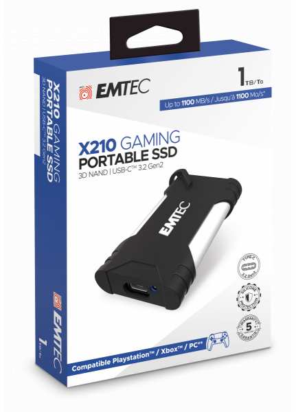 The Emtec X210G portable SSD is an essential storage solution for all your games, videos and files. It combines impressive performance with a futuristic design. Compatible with the latest gaming consoles (Playstation®, Xbox), Mac, Windows and Smart TVs. It is the best ally for storing all your games. No more compromises, save up to 30 games or more!* Save games like FIFA, Assassin's Creed, Battlefield, FarCry, SpiderMan and still have room for Call of Duty! A trendy design, a matte white body, a protective silicone sleeve and a hanging ring to accompany you everywhere.