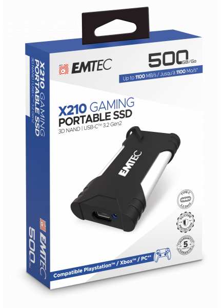 The Emtec X210G portable SSD is an essential storage solution for all your games, videos and files. It combines impressive performance with a futuristic design. Compatible with the latest gaming consoles (Playstation®, Xbox), Mac, Windows and Smart TVs. It is the best ally for storing all your games. No more compromises, save up to 30 games or more!* Save games like FIFA, Assassin's Creed, Battlefield, FarCry, SpiderMan and still have room for Call of Duty! A trendy design, a matte white body, a protective silicone sleeve and a hanging ring to accompany you everywhere.