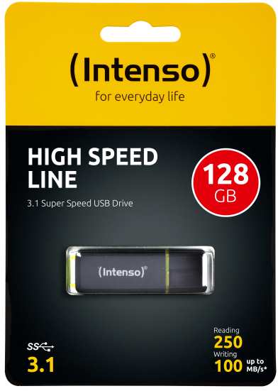 Intenso High Speed Line. Capacity 128 GB, Device interface USB Type-A, USB version 3.2 Gen 1 (3.1 Gen 1), Read speed 250 MB/s, Write speed 100 MB/s. Form factor Cap. Weight 6 g. Product colour Black, Yellow