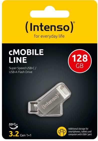 Intenso cMobile Line. Capacity 128 GB, Device interface USB Type-A / USB Type-C, USB version 3.2 Gen 1 (3.1 Gen 1), Read speed 70 MB/s. Form factor Swivel. Weight 9 g. Product colour Silver