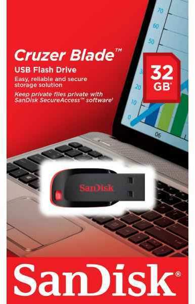 Sandisk Cruzer Blade. Capacity 32 GB, USB version 2.0, USB Type-A connector. Form factor Capless. Weight 2.5 g. Colour of product Black, Red