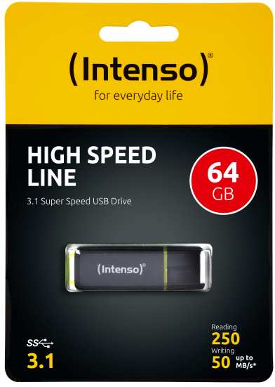 Intenso High Speed Line. Capacity 64 GB, Device interface USB Type-A, USB version 3.2 Gen 2 (3.1 Gen 2), Read speed 250 MB/s, Write speed 50 MB/s. Form factor Cap. Weight 6 g. Product colour Black, Yellow
