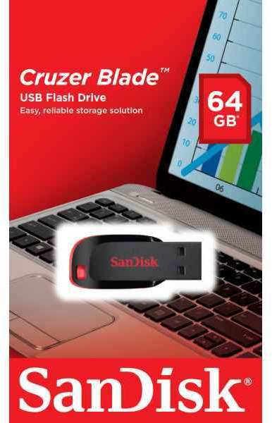 Sandisk Cruzer Blade. Capacity 64 GB, USB version 2.0, USB Type-A connector. Form factor Capless. Weight 2.5 g. Colour of product Black, Red