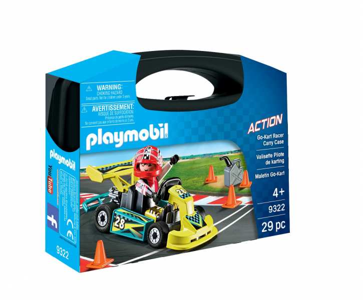 Playmobil Action Go-Kart Racer Carry Case. Product type Collectible figure, On basis of Movie & TV series, Target audience Children. Weight 261.5 g, Package width 210 mm, Package depth 55 mm. Manual languages Bulgarian, Czech, Danish, German, Estonian, Greek, English, Spanish, French, Italian, Lithuanian,..., Package type Briefcase, Package material Carton. Start availability 01-01-2019, Country of importation (ISO 3166-1) Germany, (cdm) Is accessory Toy. (cdm) Reconducted new drop Reconducted, (cdm) Seasonalities Permanent, Year End, Packaging languages (ISO 639 format) Multi