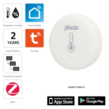 The Smart Zigbee-temperature and humidity sensor by Alecto is a useful tool to monitor both the temperature and the humidity inside your house. This smart sensor allows you to set up an action towards other Alecto smart products: these actions are provoked by the temperatures and/or humidity registered by the SMART-TEMP10 sensor.