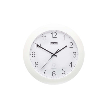 This white plastic wall clock is radio-controlled and therefore always displays the right time.
