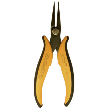 Needle-nose pliers with long smooth jaws rounded on the outside, ideal for gripping components in tight spaces without damaging them.