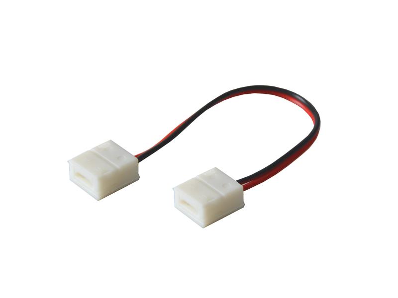 Dvoupinová spojka s vodičem pro LED pásky s krytím IP65, čipy 3528, 2835 s množstvím 30 nebo 60 LED/m a šířce 8mm. Spojka slouží k propojení více LED pásků v sérii bez nutnosti pájení. Do konektoru se jednoduše nastrčí LED pásek tak, aby napájecí kontakty pásku směřovali proti kovovým kontaktům v konektoru.
