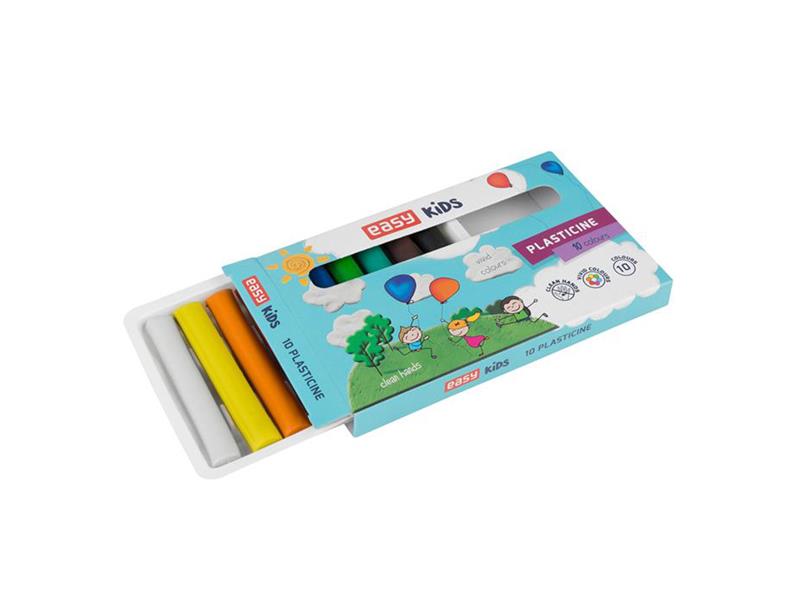 Ten rolls of plasticine of bright colors in a plastic tray and a paper box with a cheerful picture.