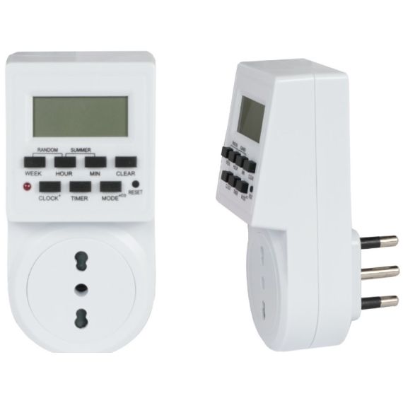 Timer programmabile settimanale digitale con batteria di memoria. Questo timer realizzato in materiale plastico di colore bianco, ha display LCD con spina del tipo 2P+T 16A e presa 2P+T 10/16A bivalente, e supporta massimo 3500W. Grazie a questo timer è possibile programmare l'accensione dell'apparecchio connesso, a intervalli 1 minuto su un'intera settimana, giorno per giorno.