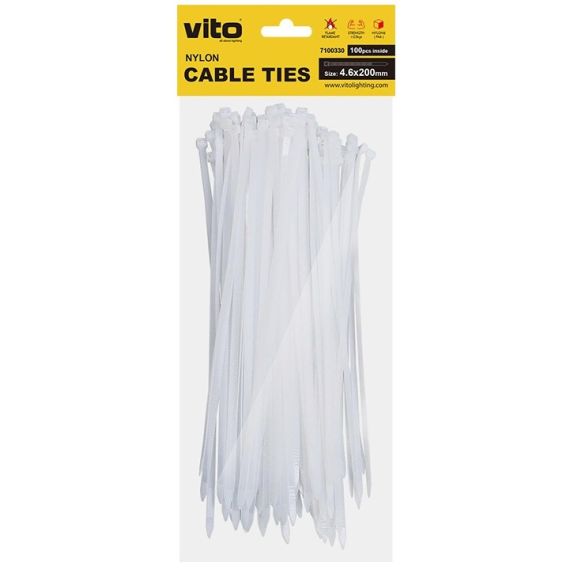 FASCETTE PER CAVI VITO PLASTICK realizzate in NYLON6 (PA6) di colore BIANCO con protezione UV e test di tensione di 22 kg. Le dimensioni di una fascetta sono 4.6X200 mm. Facile installazione manuale.