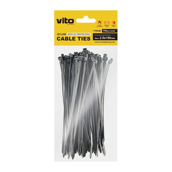 Le fascette per cavi VITO PLASTICK realizzate in NYLON 6 (PA6) sono di colore NERO con protezione UV e test di tensione di 8 kg. Ci sono 100 pezzi nella confezione. La dimensione di una fascetta è 2,5X150 mm.