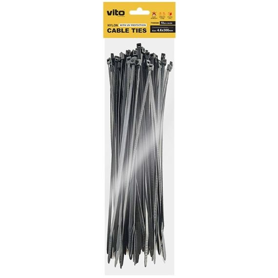 FASCETTE PER CAVI VITO PLASTICK realizzate in NYLON6 (PA6) di colore NERO con protezione UV e test di tensione di 22 kg. Le dimensioni di una fascetta sono 4.6X300 mm. Facile installazione manuale.